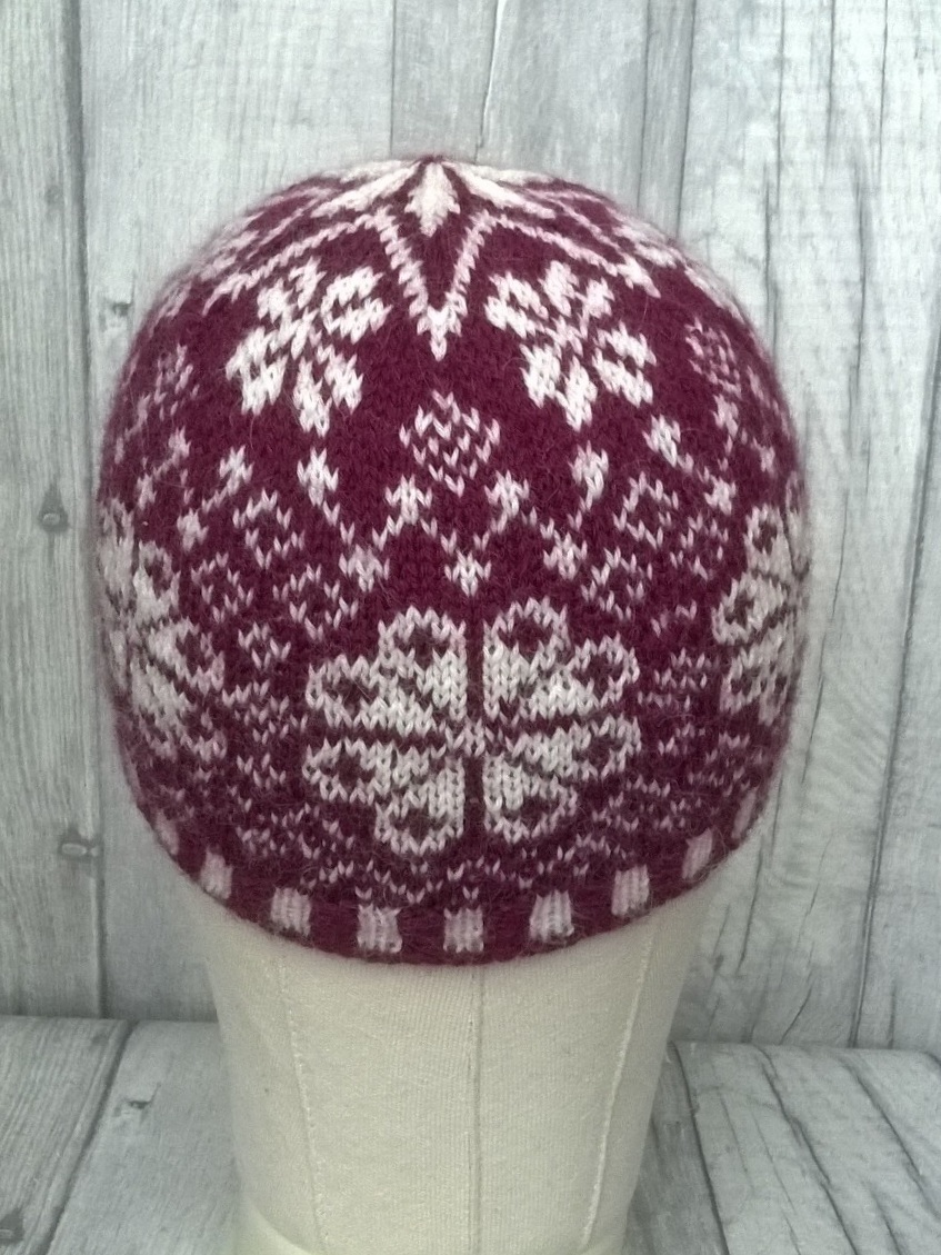 It was made in 4 ply but I reckoned I could leave out a pattern repeat or two and work it in double knit. Wihout delay I went through my stash to see what I had and came up with some cranberry red alpaca (unpicked from a pair of crochet mittens that I never wore) and the silver grey merino I usedin the second Baa-ble Hat (it was a bit on the thin side and I thought it would work well with the alpaca).